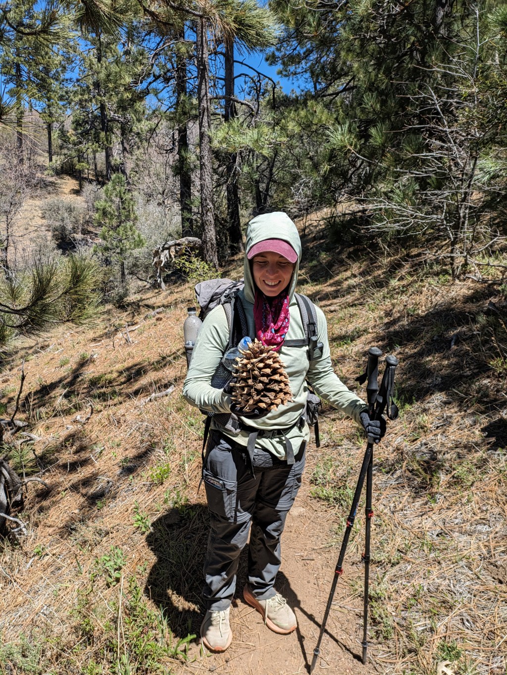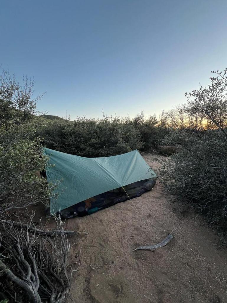 The wind is tremendous. Amber hates it. She is pushed side to side and has to fight with every step. We find a barely protected little nook amongst the chaparral and set up our tent. It falls down 10 times over the course of 3 hours before I get fed up and just drape it over us.