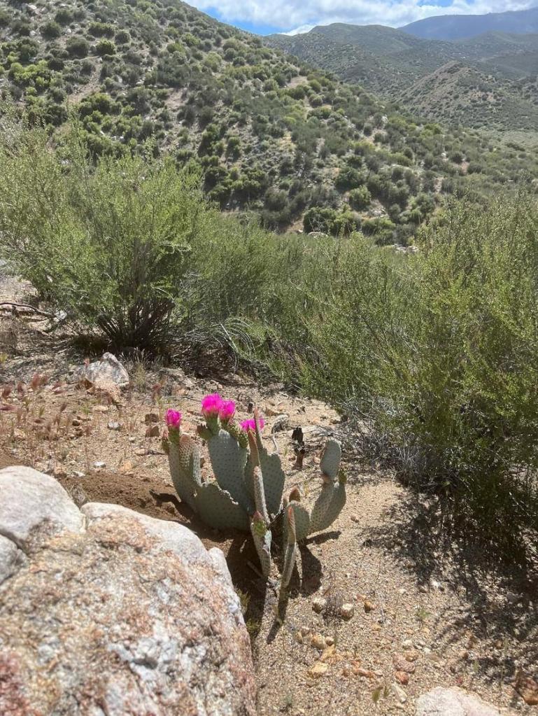 We switchback and meander endlessly downhill until we reach the desert floor. Many cactuses are in bloom, and the flowers are so vivid that they look surreal.