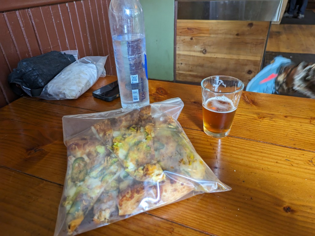We woke up in town and lazed around, taking baths and eating fruit and vegetables until it was checkout time. The weather was still crummy- 40s with rain and mist. At 11 we headed down to the local brewery/pizza shop/BBQ shop.
