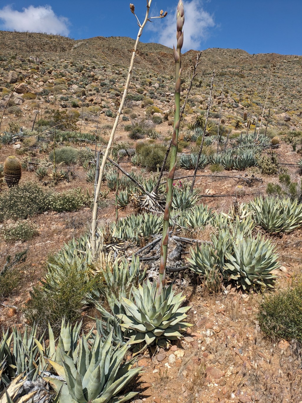 We get back on trail at 2 pm and begin our climb in the San Felipe hills- supercharged by pizza and fresh food from our town stop. We are amazed by the flowering cactus. This one looks like a huge asparagus-