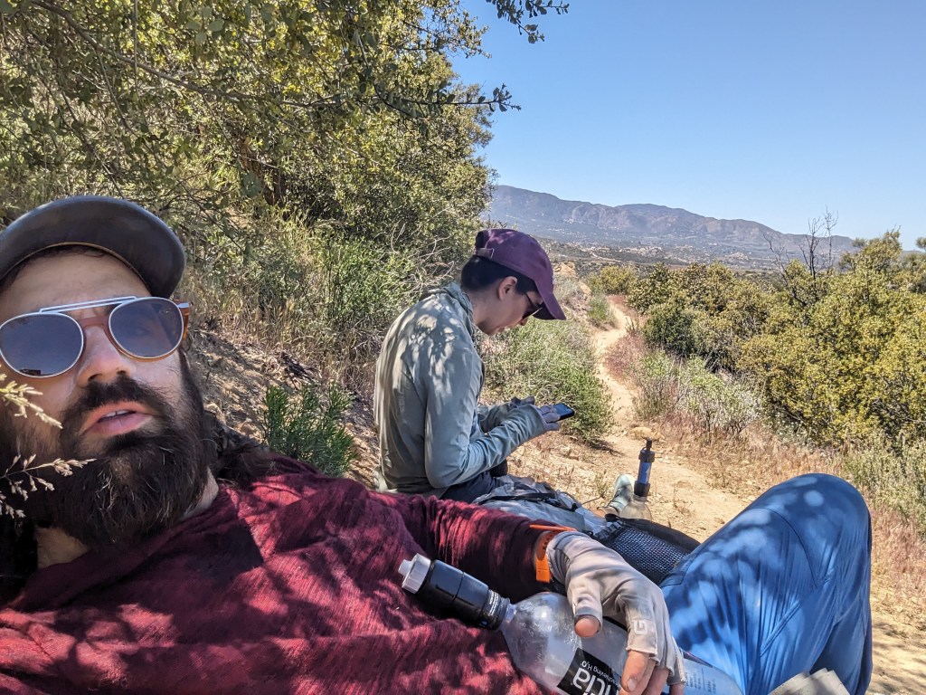 At midday, we are both struggling with the heat and sun exposure, and have to take frequent breaks in meager patches of shade to cool down.