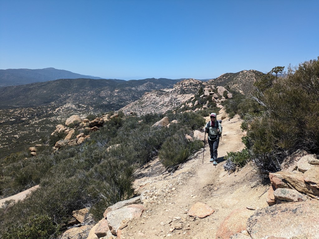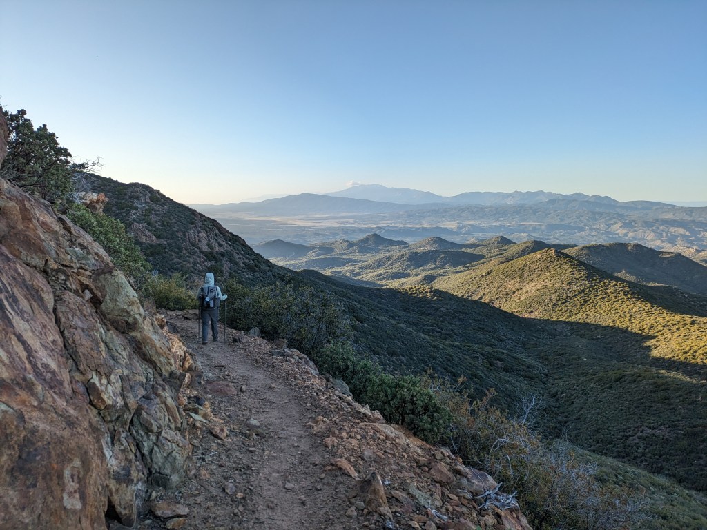 We keep climbing and follow ridge lines in sparsely vegetated desert mountains. The sun beats down on us and the hiking becomes more of a zombie walk.