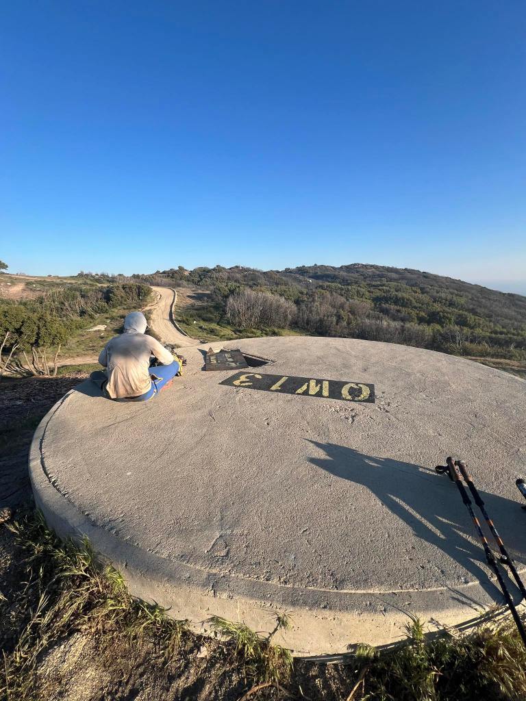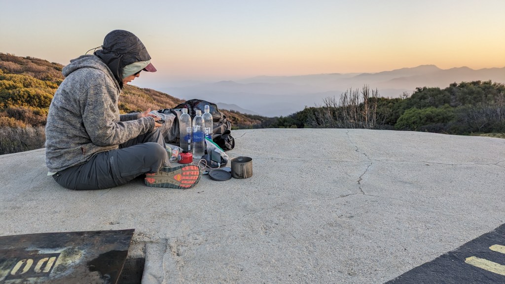 We cook our dehydrated meals and eat on the cistern and stroll into camp right after sunset.