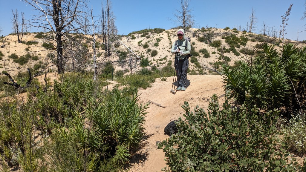 After a 3 egg breakfast at the diner, we are back on trail at around noon. From noon to 8pm we hike 18 trail miles. Along the way we pass through a large burned area that has been taken over by Poodle Dog Bush. Poodle Dog Bush thrives in areas recently burnt by wildfire and is quite irritating if it touches your skin or gets in your clothes. It is more toxic than poisonous oak. The trail is overgrown with it and we have to dip and stretch and scurry by to avoid it. You can see it on the Left side of this image.