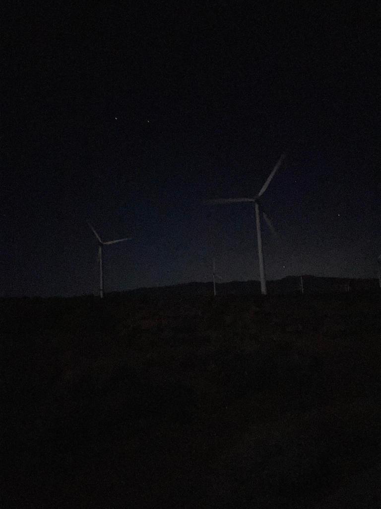 After sunset we find ourself walking through a massive wind farm. A full moon allows us to walk without headlamps, which is nice, but Amber struggles to stay upright as we are pummeled by relentless wind. We soon realized that finding a campsite may prove to be very difficult, and that the idea of setting up our shelter would be a fools errand.