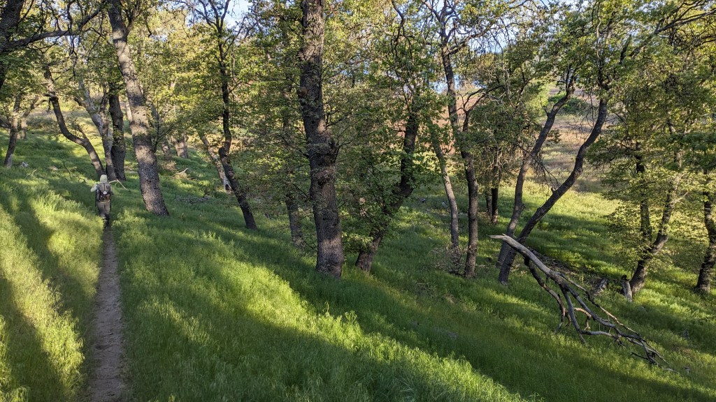 After waking and packing up, our day starts in a shockingly verdant valley between arid ridges. We are right on the edge of the Mojave desert, which makes the greenery seem all the more special. Oak trees abound on this area, since they are especially drought resistant.