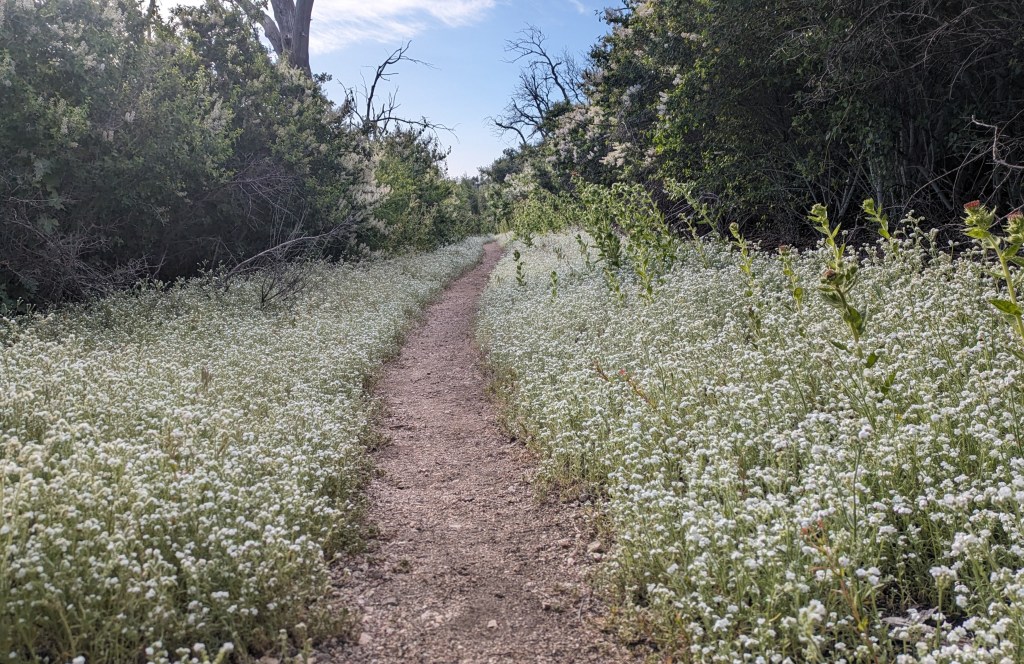 We notice that the undergrowth around the trail is covered in Miner’s lettuce, so named because gold miners ate it to avoid scurvy while living off preserved food.