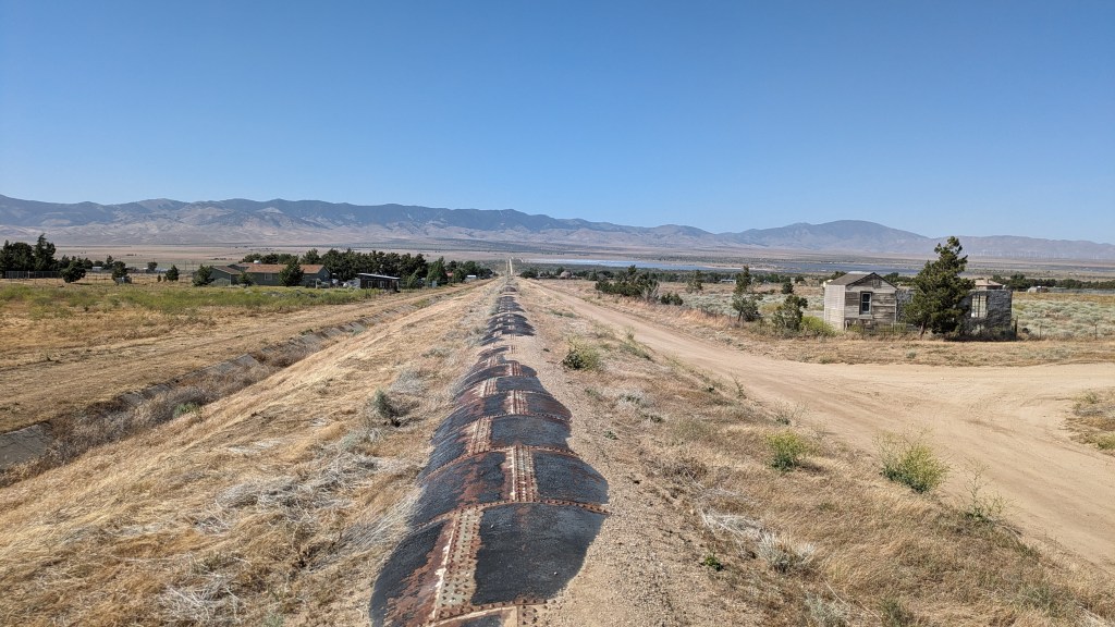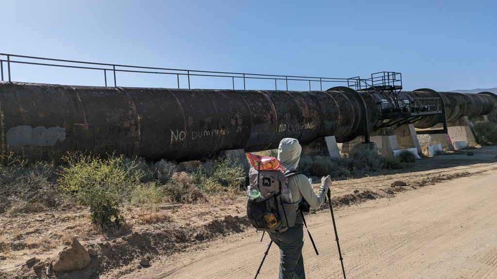 For 20 miles the PCT walks along the LA aqueduct- a 233 mile, gravity fed water pipeline that transports water from the Eastern slope of the Sierra Nevada all the way to thirsty Los Angeles. The construction of the pipeline was very controversial as it effectively ended the agricultural potential of the previously fertile Owens Valley. A series of backroom deals and deceptive tactics allowed wealthy Los Angeles businessman to obtain water rights from the Owens Valley and they soon begin diverting water to their growing metropolis. Lakes began shrinking, wells ran dry and previously fertile fields were unable to grow crops. This sparked outrage from local farmers, who began sabotaging the aqueduct. Their efforts were in vain, and the water continues to flow to this day in massive quantities. At some points the aqueduct opens up, and you can get a better sense of how much water is flowing through the area.