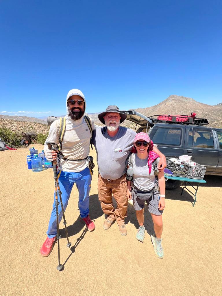 Temperatures are scorching and this next stretch of trail is made possible by locals who cache water for PCT hikers. Without their generosity and time, this stretch would be exceedingly difficult to get through and would require several gallon water carries. We come across a cache at a dirt road crossing and see a man parked with his truck. He offers us cold beers and bagel sandwiches, which we eagerly gobble down.