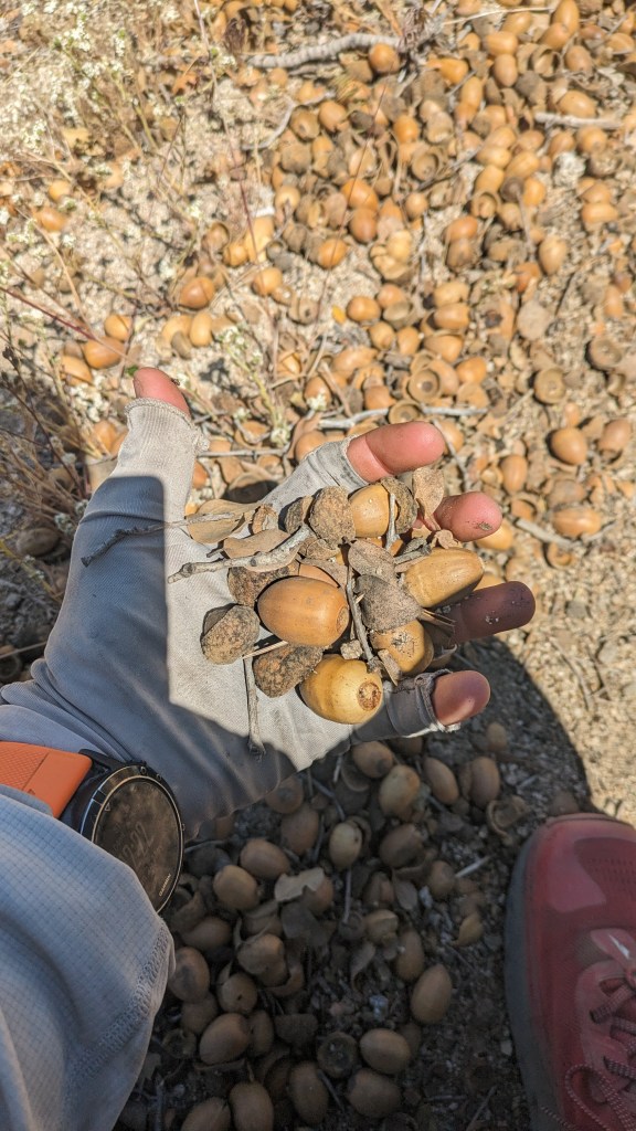 We walk through a mixed pine and drought resistant oak forest. The trail is littered with endless piles of acorns.