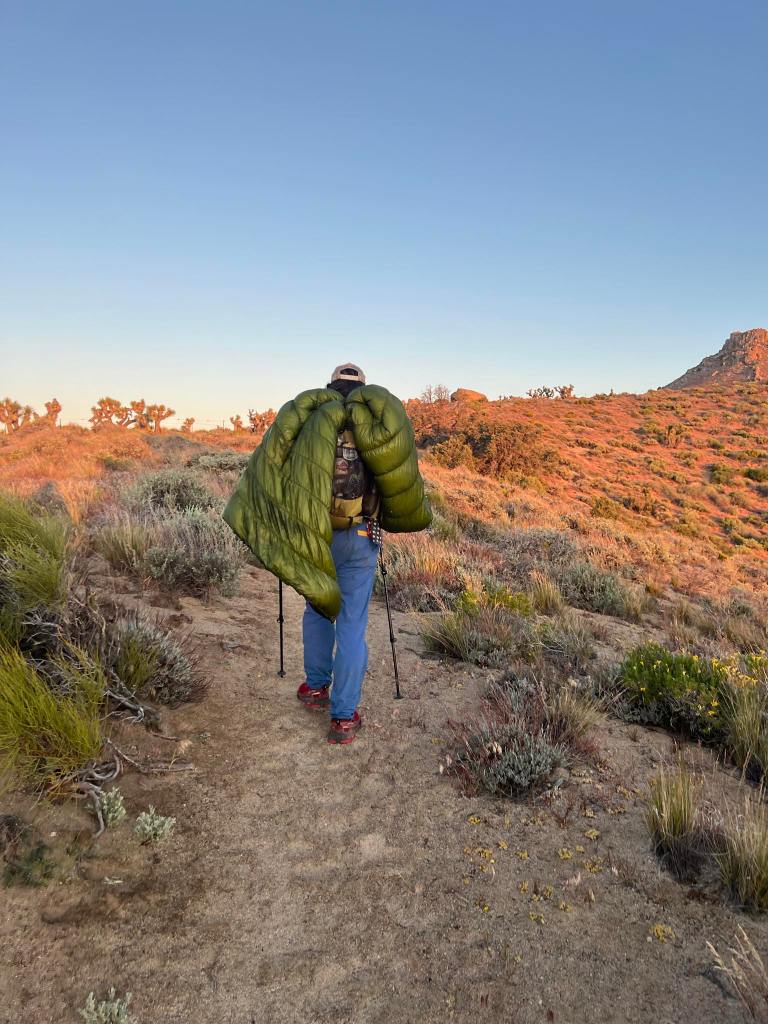 When we wake, we notice tons of condensation dripping off of our sleeping bags. We have to walk with our bags dangling from our packs- luckily they dry quickly in the hot desert wind.