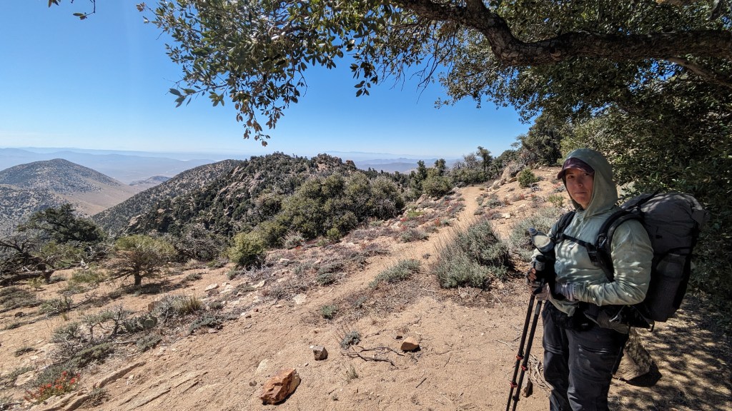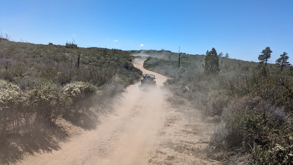 As we climb up to the pines and descend multiple times in this stretch of trail, we climb a cumulative 13,000 feet. After making it over Mt. Skinner, we once again descend to shrubbery and a network of a series of dirt roads that we share with roaring off road vehicles. We have to dive out of the way as they blindly rip round right turns in the road. They fly across the landscape, choking the air with dust. The speed with which they travel, compared to our plodding footsteps makes us laugh.