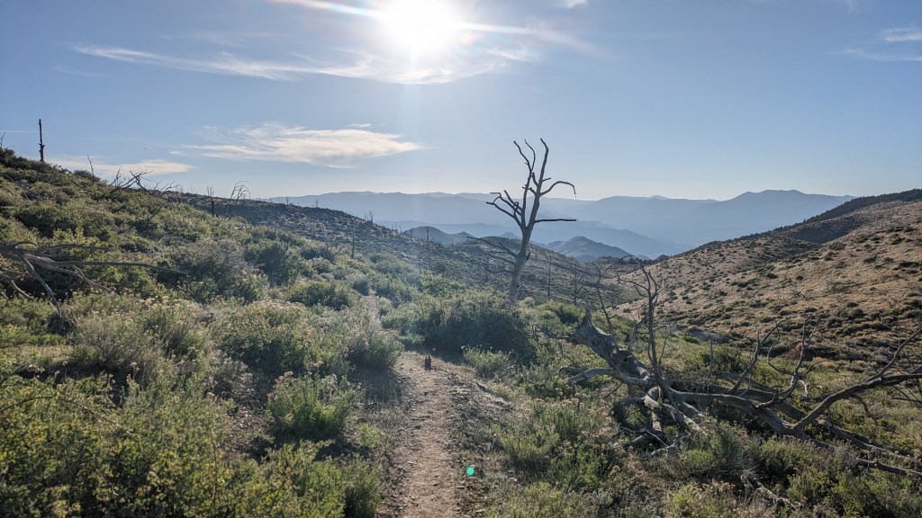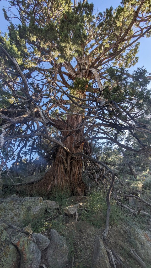 Miles pass as we endure constant climbing and descending through fairly non-descript scenery.ย  Today is a day to put headphones in and zone out.ย  We do see one of the more impressive great western juniper specimens we have ever seen.ย