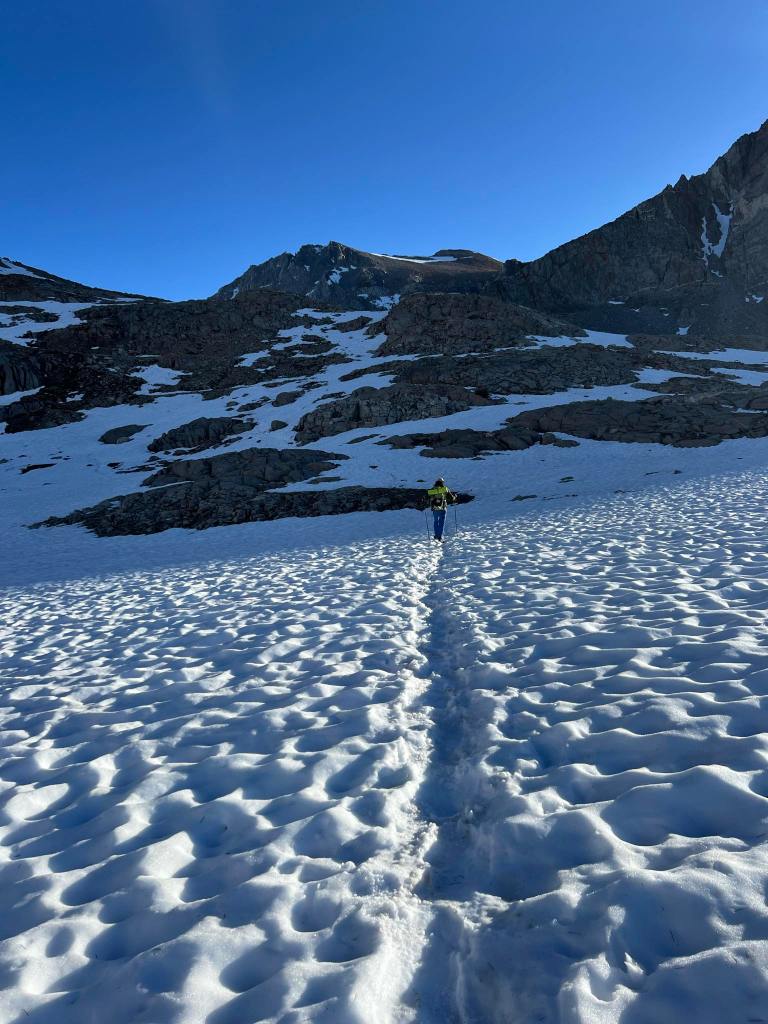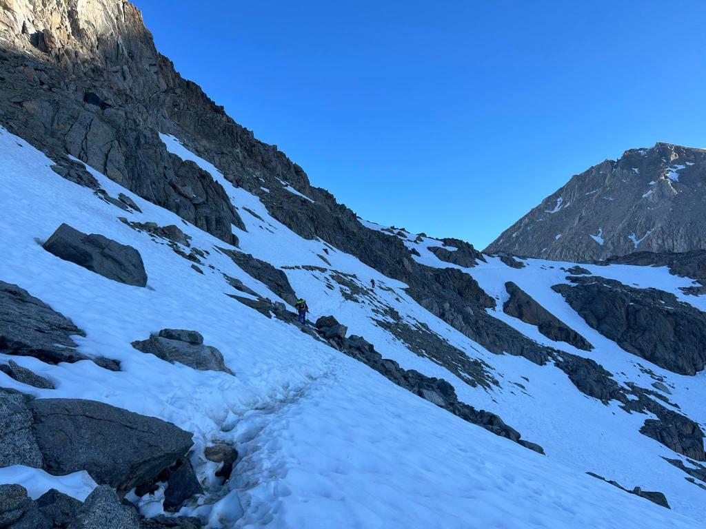 We hike up to the headwall of Mather Pass, a 500 foot wall of rock a bit after mid day. Looking up at the pass it looks like there will be quite a few traverses that will require solid snow, so we set up an early camp.