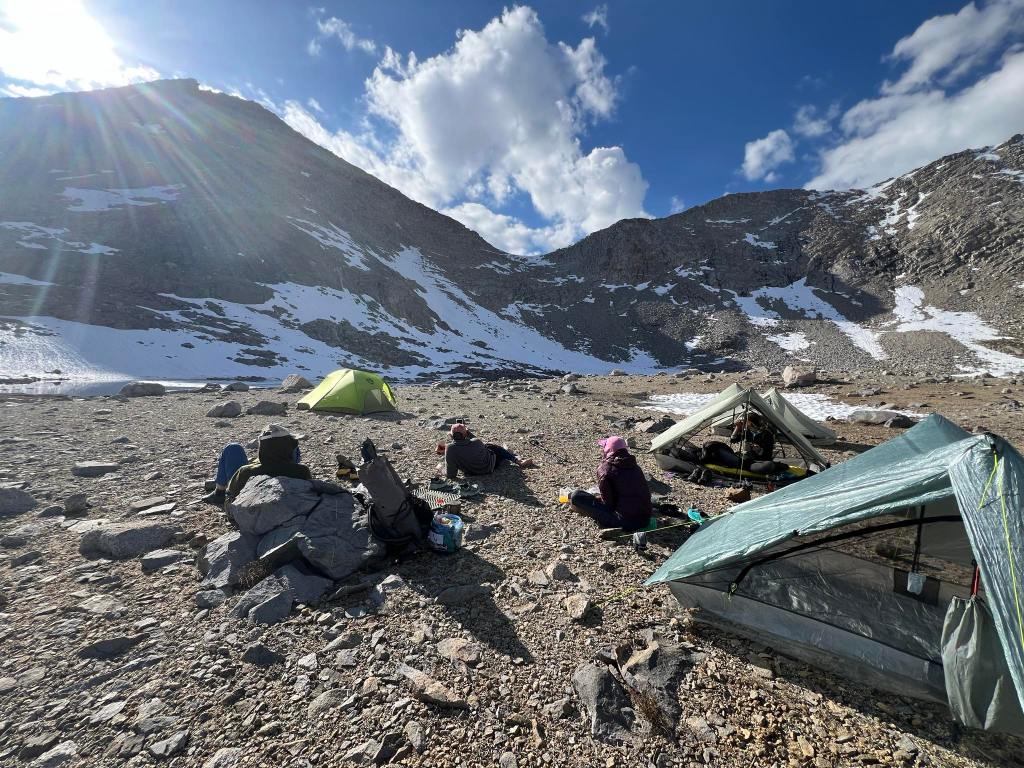 Soon Looki, Melissa, and Sunshine join us- as well as Golden, a hiker who tackled the Continental Divide trail last year. Golden has her arm wrapped in KT tape, and tells us she injured it while falling after helping the unprepared hiker down from the pass. She believes she sprained her wrist, and is uncertain if she will be able to climb up Mather Pass. Looki, a Swiss Mountaineer and experienced thruhiker, climbs partway up the pass to assess the conditions and also decides it would be best to climb in the morning.
