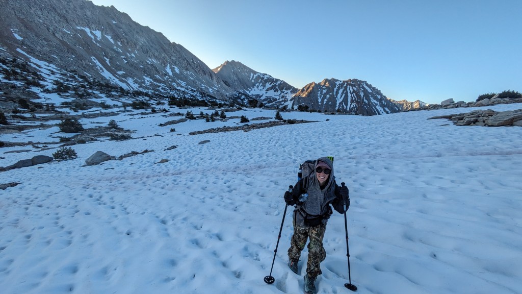 This crossing claimed the lives of two young women who were thru hiking in 2017. Together we cross the river, using all of our best water crossing techniques- facing into the current, poles out in front, side step shuffling so your feet do not have the opportunity to get washed away underneath you. The river drains from the basin surrounding Mather Pass, so we begin to suspect we will encounter tons of snow.