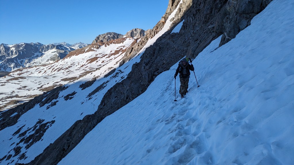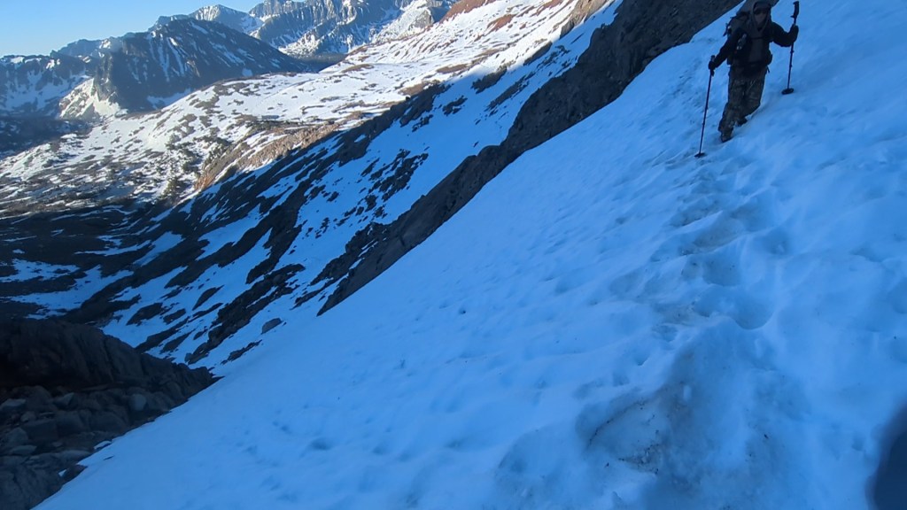 At the top of the pass, there is a surprisingly exposed final traverse. We strap our microspikes on, and find good purchase in the footprints that have slanted heavily downhill with the daytime melt.