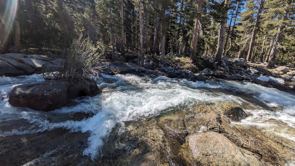 They tried to get her to press the button on her emergency Beacon to get rescued, since the only way out is over other passes, but the woman refused. We hike down from the pass with Sunshine, and wait for her at a major river crossing where the trail crosses the South Fork of the Kings River.