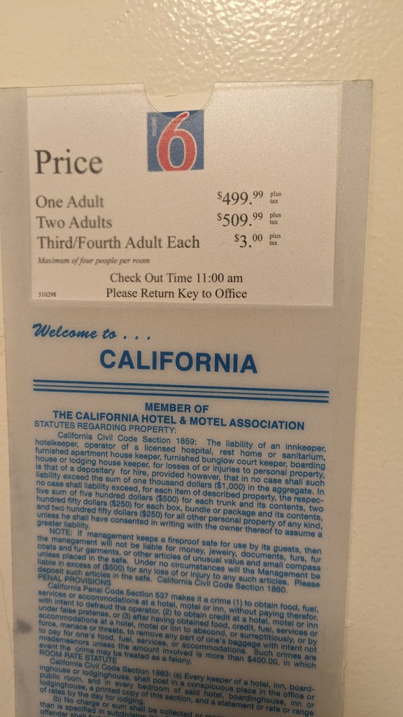 Hours pass and we get our ride to town and book a night at the local Motel 6. We are aghast to see the winter prices of this motel, when the town is bustling during ski season: