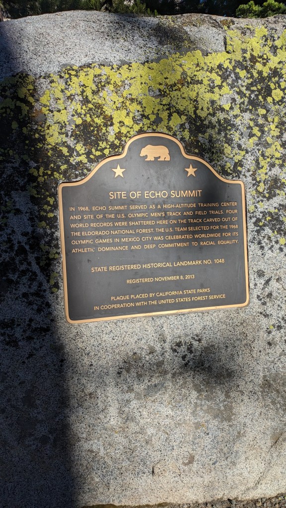 4 miles to town. We sleep in, knowing we only have a short distance to go today. This is a popular day hiking area. We can smell soap and shampoo on the air many minutes before we even encounter other people. Our senses are heightened from our time out in the bush living like coyotes. We pass Echo Summit, a place used for Olympic training due to the high elevation here.