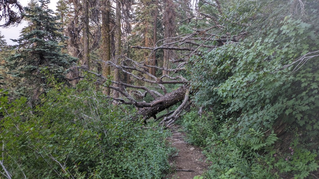Many hikers joke that the O in section O stands for “Overgrown”It is frustrating to climb over the endless amounts of blow downs and push through heavy brush, but much preferable to walking through burn areas so we try to keep our complaining to a minimum.