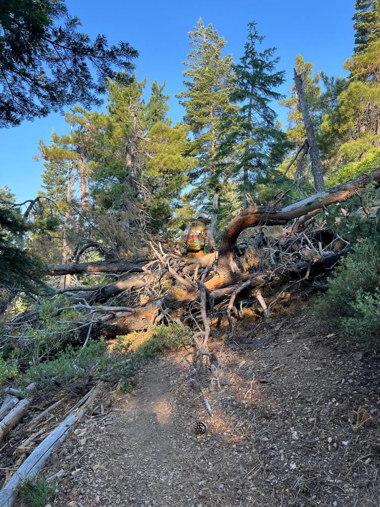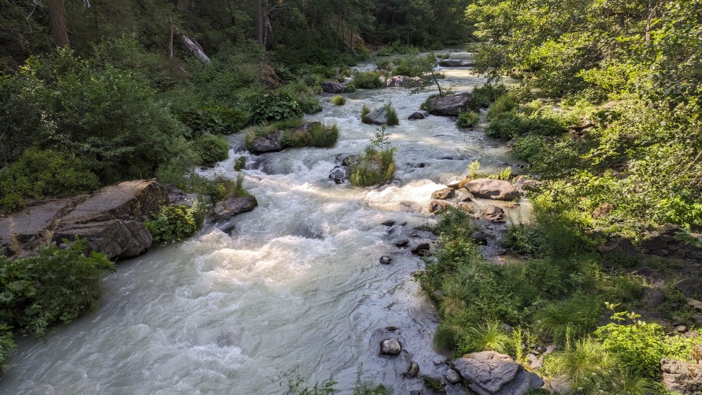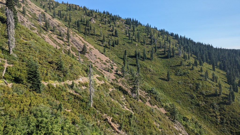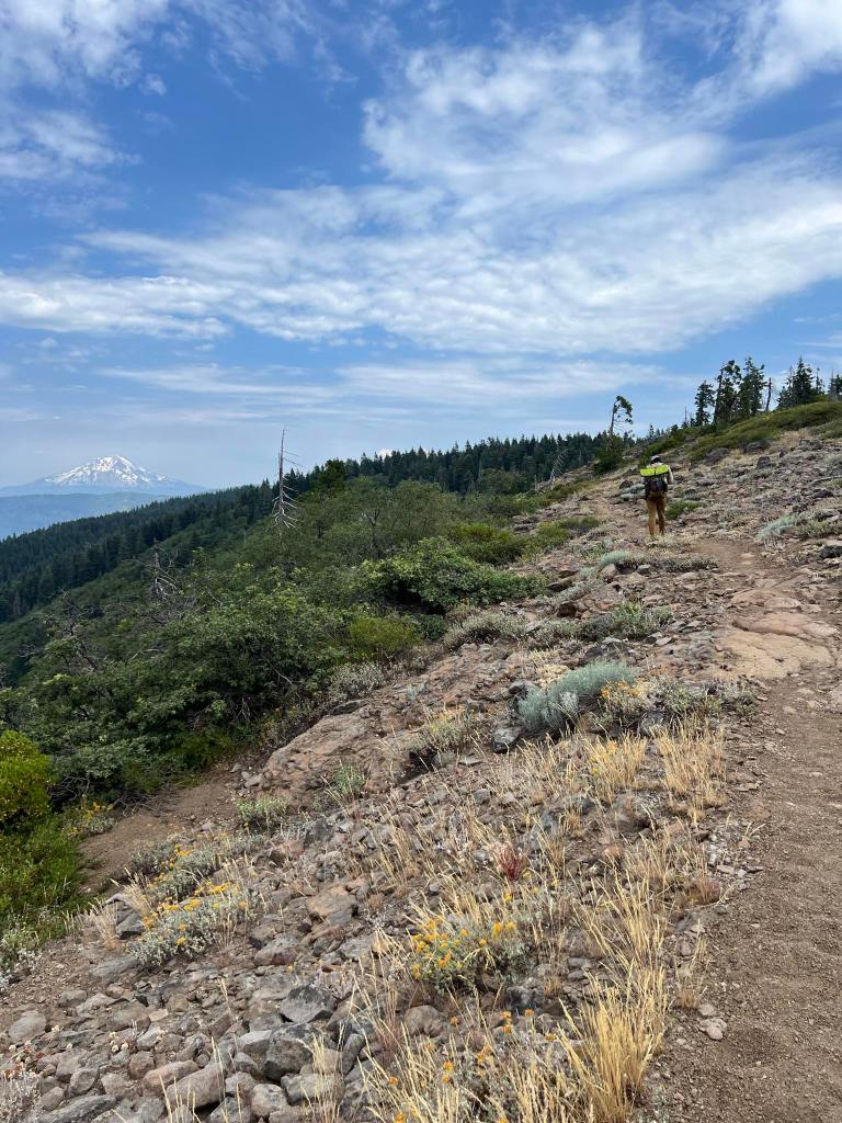 The trail remains hot, humid and overgrown. We pass our first glacial stream, flowing from nearby Mt. Shasta.