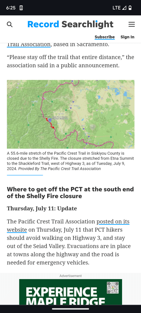 This unfortunately is a very common occurrence along this trail every year. A history of poor forest management, extended droughts, and increasing frequency of heat waves have made it very rare to be able to make it through the entire trail without encountering a closure. We were reminded of this while walking through hundreds of miles of burn scars, but we still hoped we would be able to avoid this. In town we arrange a ride up to Seiad Valley, the closest community beyond the fire closure, and then eat and gather some new gear for our next stretch. We share a hotel room with Papa bear who will be joining us on the shuttle.