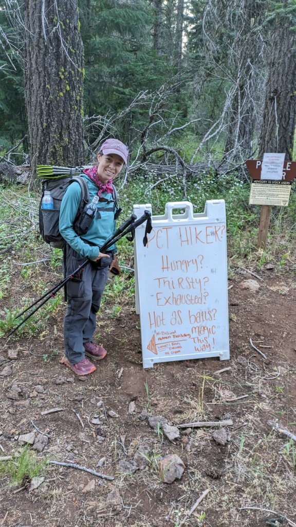 In the morning we pass by a sign on the trail offering food, drinks, and ice cream. Delighted to get a hot breakfast we follow the side trail where we are directed and find… Nothing.