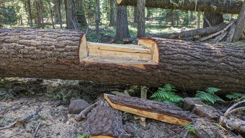 ahhhh! We eat bars and electrolyte water instead on the side of a dirt road. Lately we have been seeing an interesting feature of trail construction- when a large tree has fallen on the trail instead of cutting a section of the log the trail crew is cutting out a foot step. Often times the step is well above Amber’s waist. It seems like it would be more difficult to do this than to actually cut away the log. It drives Amber crazy.