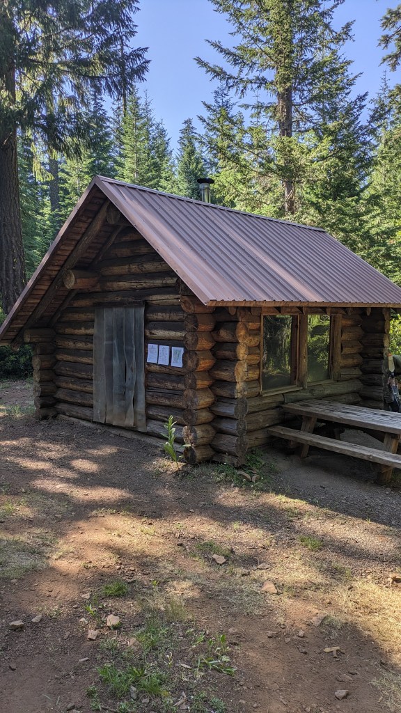 There is a long dry stretch at the end of the day, 15 miles without water on trail. I make a short detour off trail to a back country cabin with a manual pump water source and wait for amber.