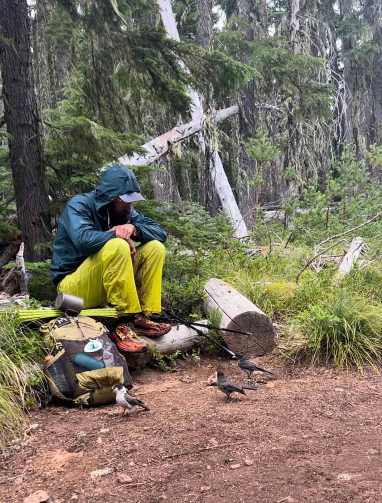 As we wake we hear our first raindrops in months splattering against our tent. As we get dressed and leave the tent we are amazed by the freshness in the air. The rain has mercifully cleared out the smoke. I usually hate hiking in rain, but the clean air and cool temps are a wonderful contrast to the smoke and heat of Northern California and Southern Oregon. With all my lost body fat I am finding I get cold much easier than usual, but I put on my rain gear and truck along.