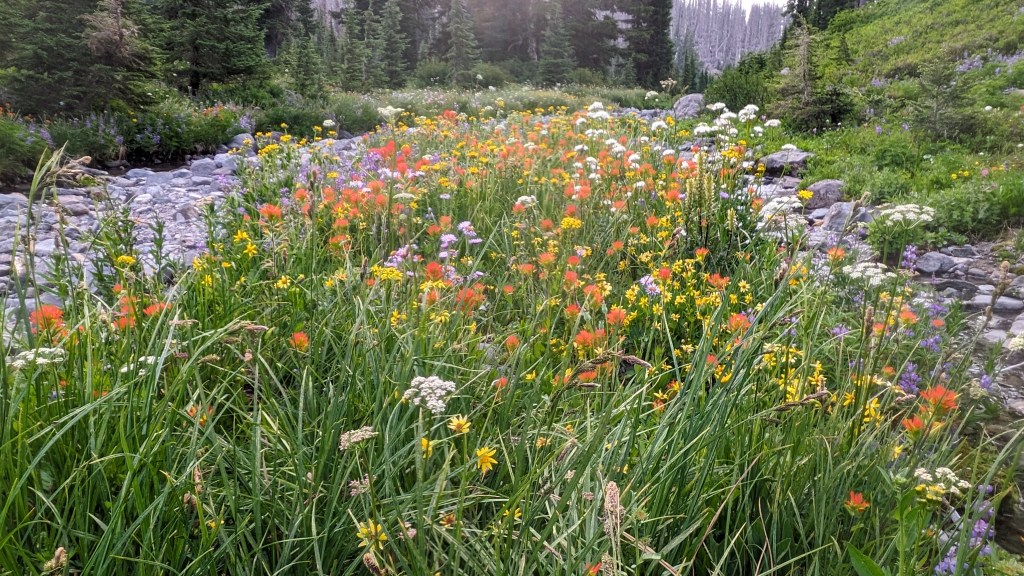 We are right on the shoulders of Mt. Jefferson, the heavily glaciated 2nd highest peak in Oregon. There are many lingering snow fields and a beautiful wildflower display.