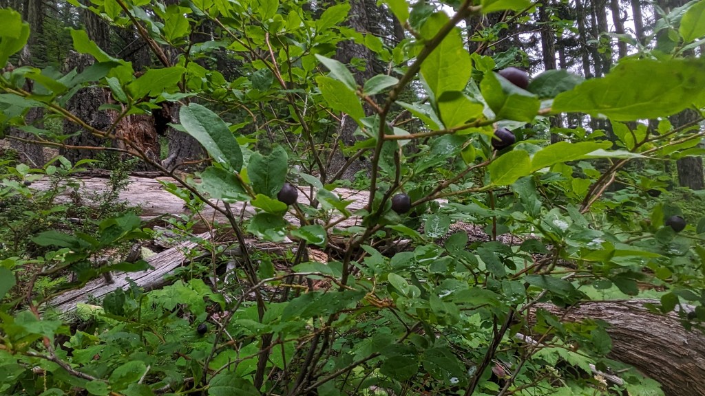 Water is abundant, and berries are becoming ripe in the lower elevation areas. We supplement our trail food with pounds of huckleberries that we grab as we walk.